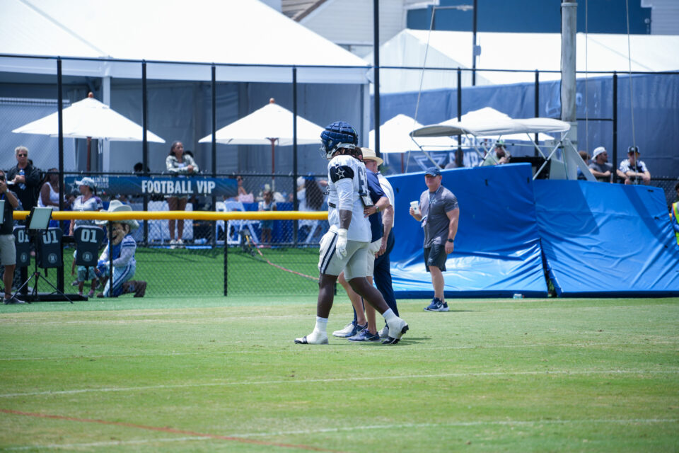 OXNARD, CA — Dallas Cowboys left tackle Tyler Guyton left practice early Monday after suffering a knee injury. The 2024 first-round pick was helped off the field and underwent tests that ruled out a major ligament tear but revealed a bone fracture.
