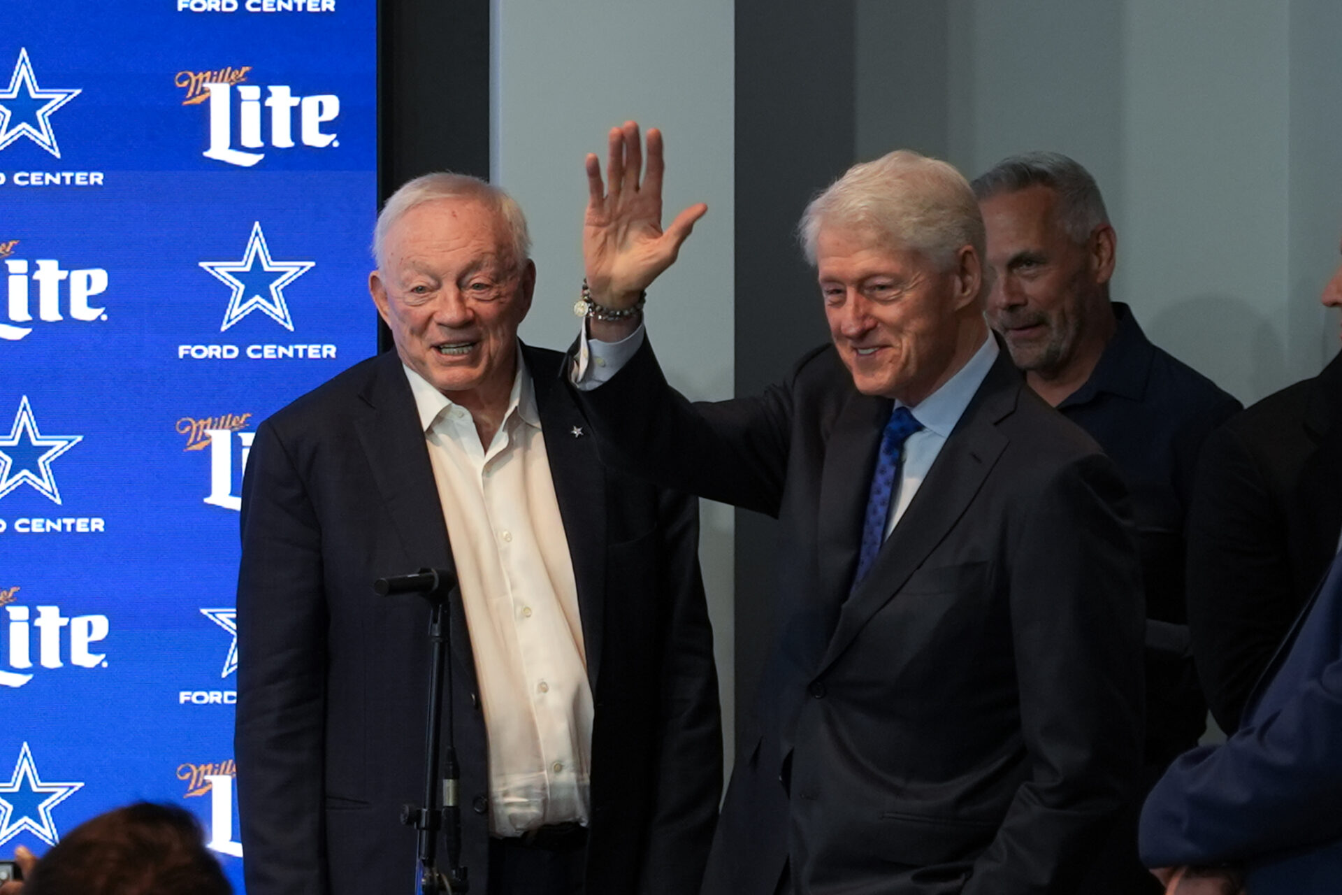 FRISCO, Texas — Former President Bill Clinton made an unexpected stop at The Star on Thursday, briefly sharing the spotlight with the Dallas Cowboys during their pre-draft press conference.